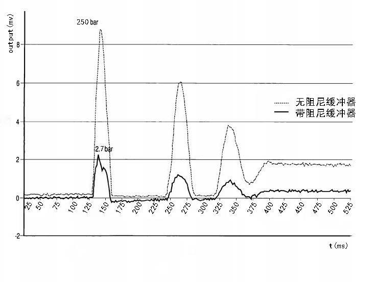 當(dāng)實(shí)際測量中出現(xiàn)水錘現(xiàn)象或瞬間超高壓時,阻尼緩沖器動作,有效過濾壓力峰值。