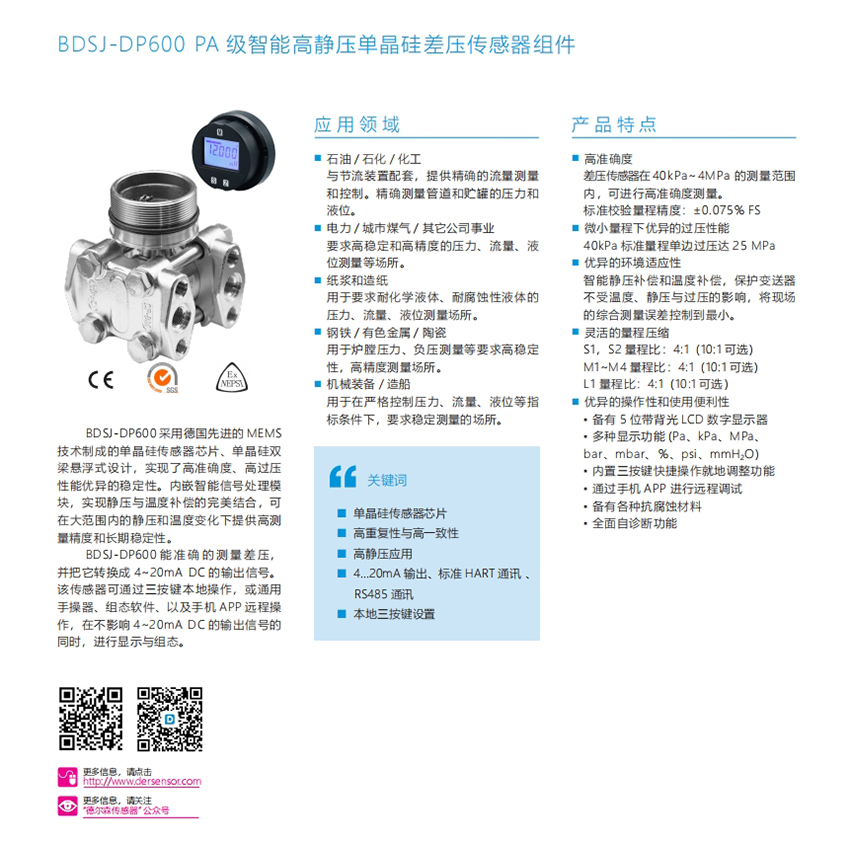 產(chǎn)品名稱: BDSJ-DP600 智能單晶硅差壓傳感器組件
