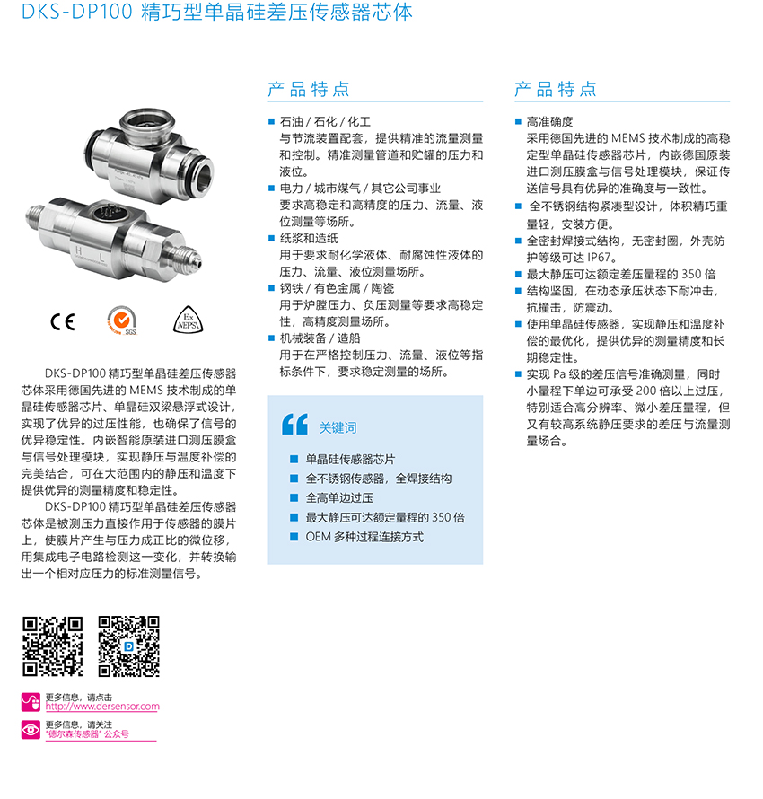 簡述: DKS-DP100 系列精巧型單晶硅差壓傳感器