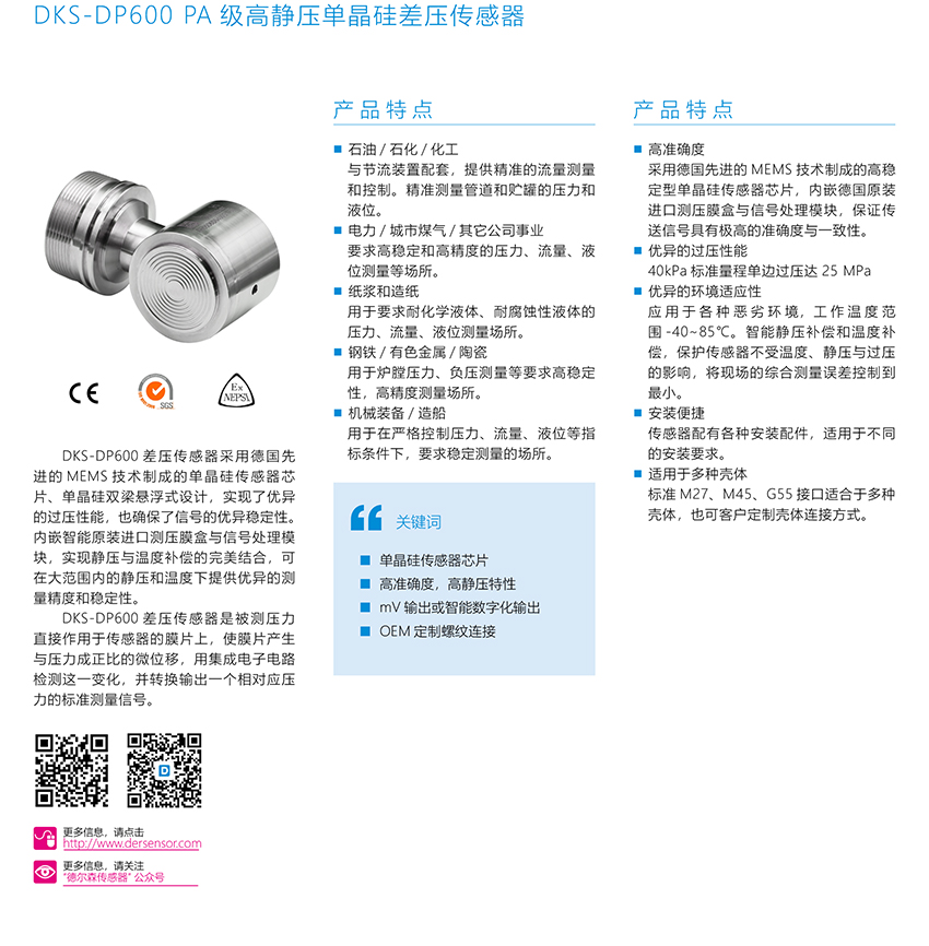 簡(jiǎn)述: DKS-DP600 系列單晶硅差壓傳感器